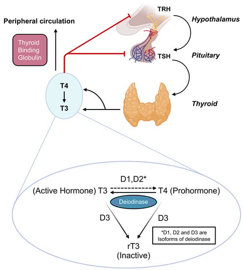 Hypothalamic Pituitary Thyroid Axis. Interactions between TRH, TSH, T3, and T4 along the hypothalamic pituitary thyroid axis are shown alongside their transport by thyroxine binding globulin and conversion by deiodinase 1, 2, and 3 [32,33,34].
