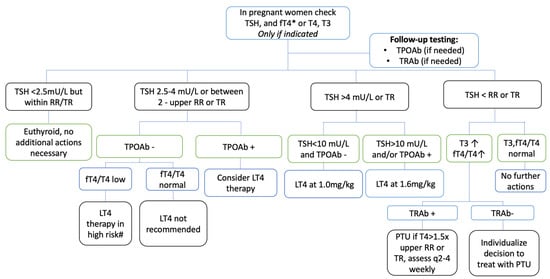 Thyroid Pathology in Pregnancy: A Decision-Making Algorithm. Key decision-making steps in treating thyroid pathology in pregnant women are outlined according to latest recommendations from ACOG and ATA. * fT4 is assay is a newer assay and trimester range published, # high risk: previous miscarriages, infertility etc. RR: non pregnant reference range, TR: Trimester specific range, TPOAb: TPO Antibodies, TRAb: TSH Receptor Antibodies [135,195].