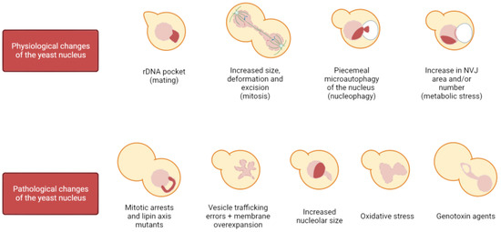 Events that alter the spherical shape of the nucleus. On the top, the yeast nucleus experiences several changes in morphology due to physiological reasons, among which we encounter the appearance of a distinct rDNA pocket when cells prepare for mating, the increase in size and elongation during mitosis, teardrop protrusions toward the vacuole in PMN, and an increase in NVJs size and/or number under stress. At the bottom, other events trigger non-physiological changes in nuclear morphology, such as the appearance of flares (NE elongation confined to the nucleolar area) in mitotic arrests and lipin axis mutants, non-localized deformations when vesicle trafficking is disrupted under membrane overexpansion conditions, upon oxidative or genotoxic stress, and when nucleolar volume is increased.