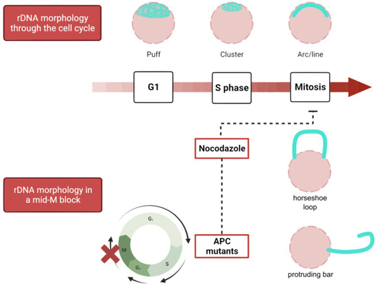 Morphological changes of the rDNA through the cell cycle and in mid-M blocks. The rDNA (in cyan; the rest of the nucleus is depicted in pink) acquires different morphologies during a normal cell cycle, from a disorganized puff in interphase which gradually transforms into a condensed and organized arc or line in mitosis. Nevertheless, in mid-M blocks caused by the microtubule depolymerizing drug nocodazole or conditional APC mutants, the rDNA develops nucleolar extensions around the rDNA array, causing the locus to protrude from the main nuclear mass as a horseshoe, a bar, etc. APC, anaphase-promoting complex.