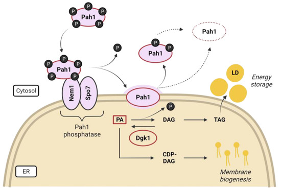 Regulatory network of the yeast lipin/Pah1. Phosphatidic acid (PA) is the central precursor in lipid biosynthesis. Pah1, the PA phosphatase, remains phosphorylated (inactive) in the cytosol under favorable growth conditions so that phospholipid biosynthesis for membrane expansion is promoted via the CDP-DAG pathway. However, when nutrients are scarce, the Nem1-Spo7 complex embedded in the ER membrane dephosphorylates Pah1 to activate it and catalyze the conversion of PA to DAG, which is further acylated and converted to TAG and stored in lipid droplets (LD). Dephosphorylated (or partially dephosphorylated) Pah1 is targeted for proteasomal degradation (adapted with permission from [127]).