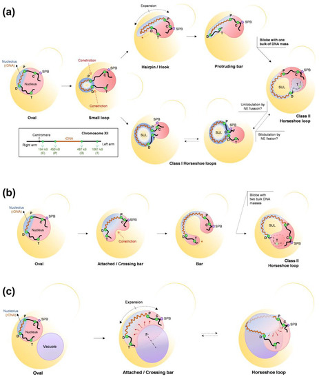 Paths of NE expansion, rDNA loop formation, and the role of the vacuole. (a,b) Paths of nucleolar envelope expansion and nuclear constrictions that shape rDNA and nuclear morphologies during the Nz-induced mid-M arrest. In (a), the NE grows outward to form the nucleolus bud after the ensuing basal constrictions. Two branches can then be drawn. In the upper branch, the nucleolus grows outward as a finger-like projection, which ends up pulling the distal cXIIr arm into the projection; the resulting protruding bar creates a bilobed nucleus that bends until both lobes overlap, giving rise to the class II horseshoe loop (dashed lines for cXIIr telomeric regions indicate that they are behind the rest of the nucleus). In the lower branch, the nucleolar NE continues expanding symmetrically in all directions, making possible the flourishing of the class I horseshoe loop, characterized by a unilobed nucleus and an NE ladle at the SUL. It remains to be determined whether classes I and II are interchangeable through NE fission and fusion events. In (b), the NE expands laterally, creating an opposing nuclear constriction so that the expanding rDNA bar/handle connects a newly formed bilobed nucleus; the bar then bends until both lobes touch each other, giving rise to another presentation of the class II horseshoe loop. (c) Schematics of how the vacuole may shape the SUL NE ladle. The vacuole can act as a scaffold for the NE to grow at the nucleolar region, perhaps from nucleus–vacuole junctions (NVJs). Vacuolar engulfment by the NE may explain the ladle shape of the SUL in horseshoe rDNA loops. The rDNA array is depicted as a dark red spring, the rest of the chromosome XII (cXII) as a black thick line, the nucleolus is in blue, and the main nuclear DNA mass is in light red. Four cXIIr reference regions are indicated by green dots (C: next to the centromere, P: proximal or centromeric rDNA flank, D: distal or telomeric rDNA flank, T: next to telomere; a cXII schematic is also depicted on the left bottom corner of panel (a)). Black arrows indicate morphological transitions, dashed black double arrows indicate the direction of NE expansion, and red dashed arrows the motion of nuclear subdomains during transitions. The budded yeast cell is outlined in yellow, and the mother cell is filled in degraded yellow. SUL: Space under the rDNA loop; SPB: Spindle Pole Body. Further details can be found in [173].