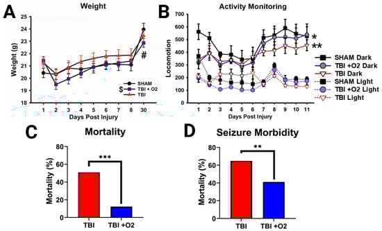 2.1. Weight, Morbidity, and Mortality following TBI in Adolescent Mice