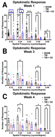 2.2. Injured Mice Have a Blunted Optokinetic Response, and Oxygen Shows Partial Rescue Acutely