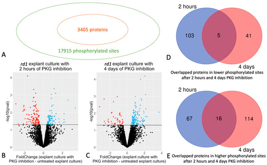 Phosphorylated sites and proteins in retinal explants affected by cGMP-dependent protein kinase (PKG) inhibition. Retinal explants generated from the rd1 strain were treated with PKG inhibitor for 2 h or 4 days, and phosphoproteomics was done via mass spectrometry (MS) after phosphopeptide enrichment. (A) 17,915 phosphorylated sites of 3405 proteins were identified. (B) Volcano plot showing Fold Change between and -Log10(p-value) of phosphorylated sites with 2 h treatment. (C) Volcano plot showing Fold Change between and -Log10(p-value) of phosphorylated sites with 4 days treatment. For both B and C, red and blue dots represent sites with decreased or increased phosphorylation, respectively (p < 0.05), while black dots represent sites without difference. (D) Venn diagram showing the overlapped proteins in decreased phosphorylated sites after 2 h and 4 days PKG inhibition. (E) Venn diagram showing the overlapped proteins in increased phosphorylated sites after 2 h and 4 days PKG inhibition.