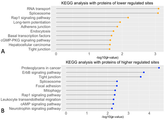 KEGG analyses of pathways connected with the observed phosphorylation changes. (A) Top 10 significant biological pathways enriched in the KEGG analysis and thus connected with proteins having decreased phosphorylated sites. (B) Top 10 significant biological pathways for sites with increased phosphorylation.