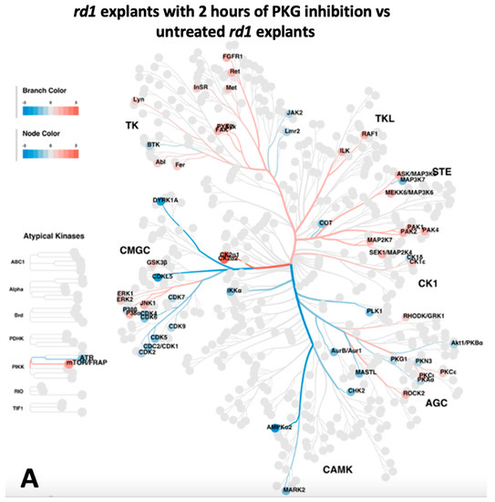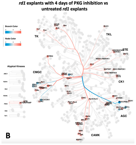 Potential altered kinases, as indicated by the upstream kinase tool, are visualized as kinome phylogenetic trees. The branch and node colors are encoded by Fold Change, with values <0 (in blue) and >0 (in red) representing kinase activity as decreased or increased, respectively, in rd1 explants with PKG inhibition compared to untreated rd1 explants. (A) Kinome phylogenetic tree with potential kinases altered in rd1 with PKG inhibition for 2 h. (B) Kinome phylogenetic tree with potential kinases altered in rd1 with PKG inhibition for 4 days.