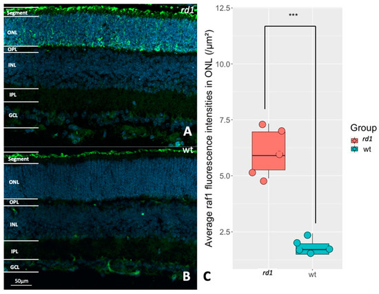 Evaluation of RAF proto-oncogene serine/threonine–protein kinase (RAF1) expression in rd1 and wt retinas. (A): Immunostaining of RAF1 (green) in a P11 rd1 retina. (B): Immunostaining of RAF1 (green) in a P11 wt retina. DAPI (blue) was used as a nuclear counterstain. (C): The box chart shows the comparison of RAF fluorescence intensities within the outer nuclear layer (ONL) between rd1 (n = 5) and wt (n = 5), *** p < 0.001.