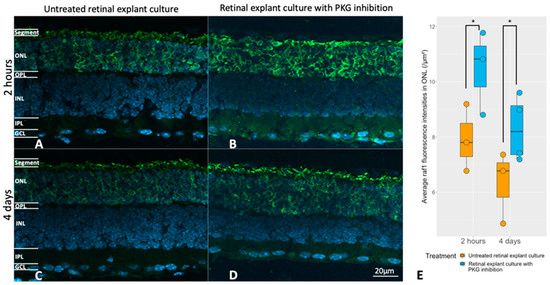 Evaluation of the relation between the cGMP-PKG system and RAF1 expression. Retinal explants from rd1 were treated with 50 μM Rp-8-Br-PET-cGMPS (PKG inhibitor) for 2 h (n = 3), and their untreated counterparts (n = 3) or the same compound in the same concentration for 4 days (n = 4) and their untreated controls (n = 3). (A,B) represent RAF1 (green) immunostaining in untreated retinal explants and their counterparts with 2 h of PKG inhibition. (C,D) represent immunostaining of RAF1 in untreated retinal explants and their counterparts with 4 days of PKG inhibition. DAPI (blue) was used as nuclear counterstain. (E) The box chart compares RAF fluorescence intensities within the ONL between untreated explants and peers with PKG inhibitors in different treatment lengths. * p < 0.05.