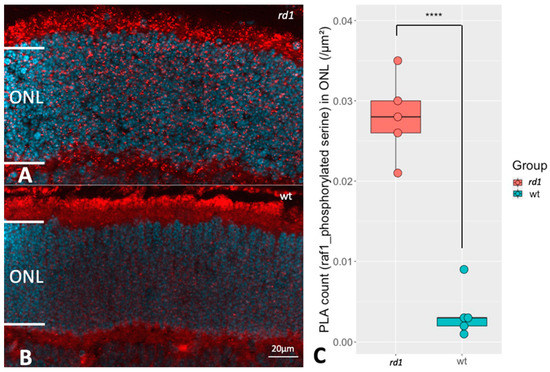 Comparison of RAF1 phosphorylation between rd1 and wt retinas. The PLA punctuations indicate that RAF1 is in proximity with phosphoserine, which reveals the RAF1 phosphorylation profile. (A,B) represent PLA punctuations (RAF1 and phosphorylated serine) in ONL from rd1 and wt, respectively. DAPI (blue) was used as nuclear counterstain (C) The box chart shows the comparison of PLA counts in ONL of retinas from rd1 (n = 5) and wt (n = 5). **** p < 0.0001.