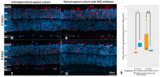 Evaluation of the relation between the cGMP-PKG system and RAF1 phosphorylation. Retinal explants from rd1 were treated with 50 μM Rp-8-Br-PET-cGMPS (PKG inhibitor) for 2 h (n = 3), and their untreated counterparts (n = 3) or the same compound in the same concentration for 4 days (n = 4) and their untreated controls (n = 3). (A,B) represent PLA (red, RAF1, and phosphorylated serine) in untreated retinal explants and the counterparts with 2 h PKG inhibition. (C,D) represent PLA punctuations in untreated retinal explants and the counterparts with 4 days PKG inhibition. DAPI (blue) was used as nuclear counterstain. (E) The box chart shows the comparison of PLA counts within ONL between untreated retinal explants controls and peers with PKG inhibitors in different lengths of treatment (n = 3–4). * p < 0.05.