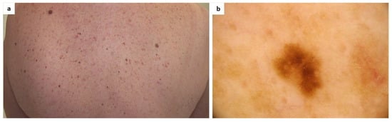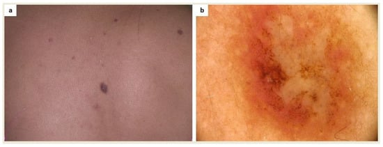 (a) A patient diagnosed with maculopapular cutaneous mastocytosis (MCM) and multiple melanocytic nevi was referred for surgical excision due to an atypical skin lesion in the interscapular area; (b) Dermoscopy revealed asymmetry of color and structures as well as a polymorphic vascular pattern (FotoFinder, Medicam 800 HD, ×20). Based on histopathological evaluation, a collision of melanocytic compound nevus and mastocytoma was diagnosed.