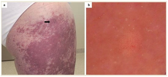 (a) A patient diagnosed with systemic mastocytosis with cutaneous involvement who had noticed an amelanotic nodule within coalescing mastocytosis skin lesions on the right thigh (arrow); (b) Dermoscopy showed a polymorphic vascular pattern (a non-specific sign of malignancy) which led to diagnostic excision (FotoFinder, Medicam 800 HD, ×20). Histopathological examination showed a cumulation of mastocytes.