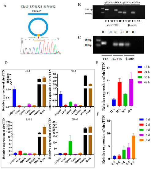 Characterization analysis of circTTN. (A) circTTN source diagram and the joint sequence by sanger sequencing. (B) The authenticity of circTTN was detected by divergent primer and convergent primer. (C) The stability of circTTN was determined by RNase R digestion. (D) The expression of circTTN in different tissues of Ningxiang pig at 30 d, 90 d, 150 d, and 210 d after birth was detected. (E) circTTN expression in C2C12 cells during proliferation period was detected. (F) circTTN expression during C2C12 cells differentiation was detected.