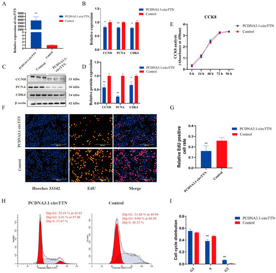 Effect of overexpression of circTTN on proliferation of C2C12 cells. (A) Transfection efficiency was screened by qRT-PCR 24 h after transfection with circTTN overexpression (PCDNA3.1-circTTN) and empty vector (control). The transfection condition is 4.0 μg PCDNA3.1-circTTN/control and 10 μL Lipofectamine 2000 reagent. (B) The effect of circTTN overexpression was detected by qRT-PCR on proliferation biomarker genes at the mRNA level. (C) The effect of circTTN overexpression was detected by Western blot on proliferation biomarker genes at the protein level. (D) Gray scale analysis of protein band in B. (E) Detection of cell proliferative activity using CCK8 after transfection with PCDNA3.1-circTTN and control. (F) Cell proliferation was detected by EdU. Scale bars indicate 200 μm. (G) EdU-positive cells were counted. (H) Cell cycle changes were detected using flow cytometry. (I) Count the number of proliferating cells during the cell cycle. * p < 0.05 and ** p < 0.01. Results are presented as mean ± S.E.M. n = 3.