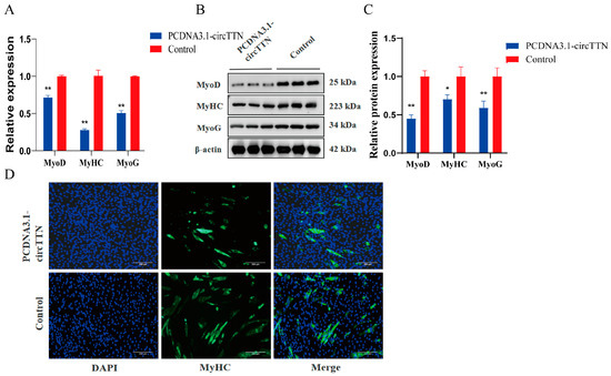 We further explored the effect of circTTN on the differentiation of C2C12 cells; the overexpressed circTTN vector was transfected into cells for induction differentiation culture, and then, qRT-PCR and a Western blot assay were used to detect the expression of differentiation biomarker genes. The overexpression of circTTN significantly inhibited the expression of differentiation biomarker genes (MyoD, MyHC, and MyoG) at the mRNA level (Figure 3A) (p < 0.01). At the protein level, the expression of MyoD and MyoG were markedly repressed (p < 0.01), significantly inhibiting the expression of MyHC (p < 0.05) (Figure 3B,C). In addition, an immunofluorescence assay was used to observe the changes in phenotypic myotube differentiation, and the number in differentiated myotubes in the circTTN overexpression group was significantly reduced compared with the control group (p < 0.05) (Figure 3D). These results indicate that circTTN inhibited the differentiation of C2C12 cells.