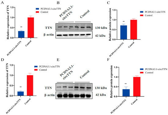 TTN is a coding gene that plays an important role in skeletal muscle. We intended to discover if circTTN acts on host gene TTN. The qRT-PCR results implied that circTTN overexpression significantly downregulated TTN gene expression during the proliferation period (Figure 4A) (p < 0.01). At the protein level, the overexpression of circTTN was markedly lower during proliferation compared with the control group (Figure 4B,C) (p < 0.01). Similarly, the effect of circTTN overexpression on the TTN gene during differentiation was consistent with that during proliferation, and the mRNA and protein levels of circTTN were significantly decreased compared with those of the control group (p < 0.01) (Figure 4D–F).