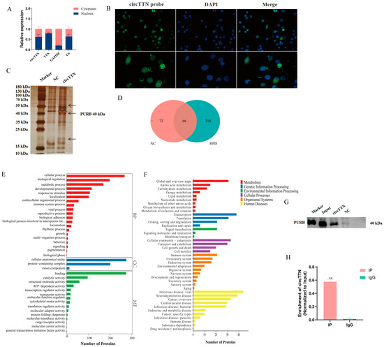 First, we determined the subcellular localization of circTTN by nucleoplasmic isolation and RNA fluorescence in situ hybridization experiments. GAPDH and U6 were used as reference genes in the cytoplasm and nucleus, respectively. The results showed that circTTN and TTN mRNA existed in the nucleus and cytoplasm, but most of them were located in the nucleus (Figure 5A). The results of the FISH experiment were consistent with the results of nucleoplasmic separation. (Figure 5B). These results suggest that circTTN may be regulated in the nucleus. circRNA can interact with RNA-binding proteins to influence the expression of parent genes. We then examined circTTN-bound proteins using an RNA pull-down assay. The circTTN group showed obvious bands of difference compared with the control NC group (Figure 5C). Subsequently, a total of 356 proteins were identified using mass spectrometry (MS) analysis, among which 218 different proteins were found in the circTTN group (RPD group) (Figure 5D, Table 1). Gene ontology (GO) functional enrichment analysis and Kyoto Encyclopedia of Genes and Genomes (KEGG) analysis were conducted, respectively. GO functional enrichment showed that these proteins were mainly enriched in cellular processes, protein complexes, regulatory translation activities, biological regulation, developmental processes, and binding. KEGG suggested that some proteins were enriched in transcription, translation, and metabolism (Figure 5F). These results implied that circTTN may bind to these proteins and play a certain function. Next, the expression of Pur-beta (PURB) protein in the RNA pull-down eluent was detected using a Western blot assay (Figure 5G), and it was found that the expression of PURB protein could be only detected in the circTTN group’s eluent. In addition, we reversely demonstrated an interaction between PURB protein and circTTN through an RIP experiment (Figure 5H). The results showed that the PURB antibody could be significantly enriched to circTTN (p < 0.01), further supporting the idea that circTTN interacts with PURB.