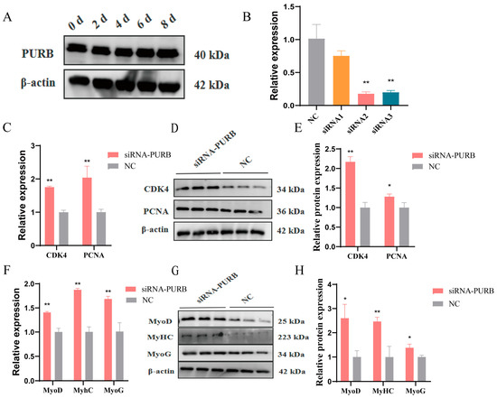 Knockdown effect of PURB on proliferation and differentiation of C2C12 cells. (A) PURB protein expression in naturally differentiated C2C12 cells. (B) Screening of siRNA sequences by qRT-PCR 24h after transfection with siRNA-PURB and NC. The transfection conditions are 100 pmol siRNA-PURB/NC and 5 μL Lipofectamine 2000 reagent. (C) The effect of siRNA-PURB proliferation biomarker genes at mRNA level. (D) The effect of siRNA-PURB on proliferation biomarker genes at the protein level. (E) Gray scale analysis of protein bands in (D). (F) At 72 h after transfection and differentiation, qRT-PCR was used to detect the effect of siRNA-PURB on the mRNA level of differentiation biomarker genes (G) The effect of siRNA-PURB on differentiation biomarker genes at the protein level. (H) Gray scale analysis of protein bands in Figure (G). * p < 0.05 and ** p < 0.01. Results are presented as mean ± S.E.M. n = 3.