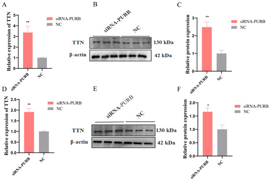To explore the effect of PURB on the TTN gene, siRNA-PURB was transfected into C2C12 cells, and the effects of PURB on TTN during proliferation and differentiation were detected, respectively. The results show that the mRNA and protein levels of siRNA-PURB were significantly higher than those of the control group at the proliferation stage (p < 0.01) (Figure 7A–C). siRNA-PURB were markedly increased compared with the control group at the differentiation stage (p < 0.01) (Figure 7D), and the protein level was significantly elevated (p < 0.05) (Figure 7E,F). These results indicate that PURB inhibited TTN gene expression.
