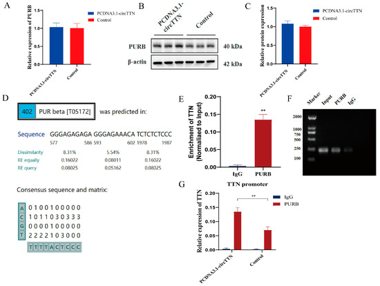 We intended to verify whether PURB are regulated by circTTN. After circTTN overexpression, PURB induced no significant changes in mRNA and protein levels (Figure 8A–C) (p < 0.05). This indicated that circTTN overexpression did not affect the PURB expression level. In a previous study, the effects of circTTN and PURB on the TTN gene were explored, respectively. Then, we utilized the UCSC Genome Browser (http://genome.ucsc.edu/ accessed on 25 August 2022) and PROMO database (https://alggen.lsi.upc.es/cgi-bin/promo_v3/promo/promoinit.cgi?dirDB=TF_8.3 accessed on 25 August 2022) for bioinformatics analysis. We found that the PURB binding motif was present at the TTN promoter (Figure 8D), and then, ChIP-qPCR was used to further verify the binding of PURB and the TTN promoter. PURB protein significantly bound to the TTN promoter (Figure 8E,F) (p < 0.01). After circTTN overexpression, we found that PURB protein bound to the TTN promoter was significantly higher than in the control group (p < 0.01) (Figure 8G). Our study suggested that circTTN inhibited the transcription of the host gene TTN by recruiting PURB protein.