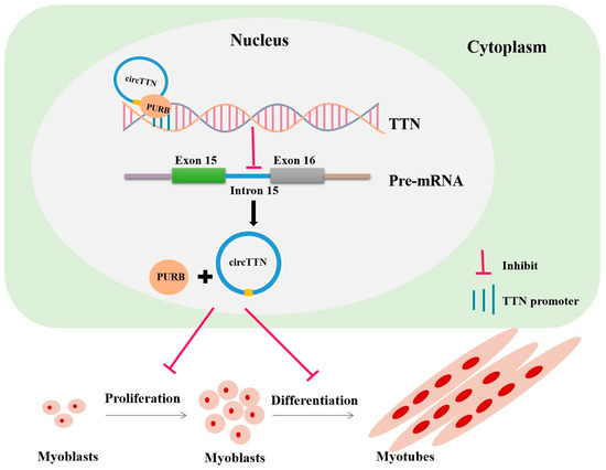 Skeletal muscle plays a role in coordinating movement and maintaining normal metabolism in organisms [17]. At present, circRNA is involved in skeletal muscle proliferation and differentiation as a positive or negative regulator of skeletal muscle myogenesis [18]. The C2C12 cell line is a valuable in vitro model, originally monocytes, which can rapidly integrate into multinucleated myotubes after culture with an induced differentiation solution [19]. Due to its unique biochemical characteristics, researchers can better understand the metabolism and differentiation of skeletal muscle at cellular and molecular levels [20]. Sun et al. [21] identified circCSDE with a stable and high expression in porcine skeletal muscle and studied the function of circCSDE on C2C12 cells, where they found that circCSDE1 and its target miR-21-3p jointly regulated the proliferation and differentiation of myoblasts. In their study, the mechanism of circCSDE regulating the growth and development of skeletal muscle in the porcine skeletal muscle injury model was verified. In our study, we first reported that circular intronic RNA circTTN acts as a negative regulator of myogenesis and inhibits the transcription of the host gene TTN by recruiting PURB protein in the nucleus (Figure 9).