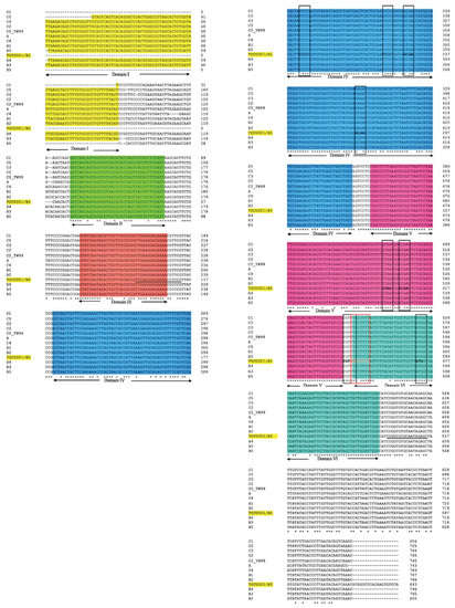 Multiple alignments of 5′ UTR of the major 12 genotypes of EV-A71 and TUCU001/B5 are performed by Clustal Omega. The identical nucleotides are indicated by the asterisks at the bottom of the alignments, and gaps (-) are introduced to optimize the alignments. Domains II to VI of enteroviral type I IRES on the multi-aligned 5′ UTR sequences are annotated by comparing them with C2_TW98 template sequences. The nucleotides underlined in domain III and downstream of domain VI were primer annealing sites for amplification of the interested domains IV, V, and VI. Conserved motifs are indicated by a black and red colored box. Areas colored in yellow, green, orange, blue, pink, and teal indicated 5′ UTR domains I to VI, respectively. * indicated identical nucleotides. - indicated gap of unaligned nucleotides.