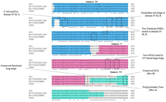 Multiple alignments of IRES domains IV, V, and VI of EV-A71 strain TUCU001/B5, EV-A71 strain 4643TW98 (or C2_TW98), human poliovirus (PV1), and coxsackievirus B (CVB3) to annotate signature motifs of type I IRES. Areas colored in blue, pink, and teal indicated IRES domains IV to VI, respectively. * indicated identical nucleotides. - indicated gap of unaligned nucleotides.