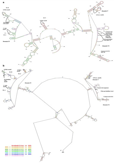 Predicted secondary structure of EV-A71 TUCU001/B5 IRES; (a) domains IV, V, and VI with flanking nucleotides from the plasmid which were in vitro transcribed together with the target sequence (total 528 nucleotides) and (b) the full-length IRES. Nucleotide numberings were annotated according to the 5′UTR sequence multiple alignments. The colors of each dot represented the % probability of the base-paring as indicated in the (b).