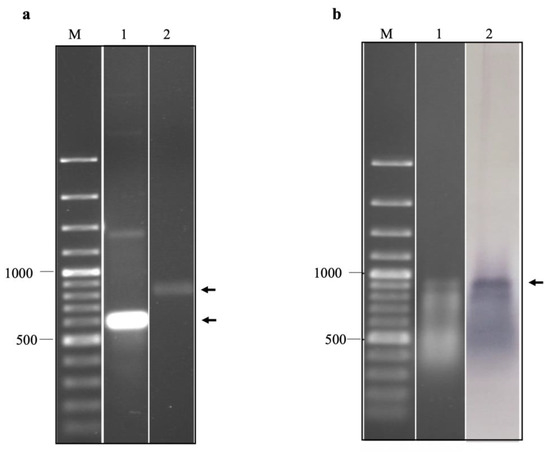 (a) Agarose gel electrophoresis of in vitro transcripts of EV-A71 TUCU001/B5 IRES domains IV, V, and VI prepared under non-denaturation (lane 1) and relaxed conditions (lane 2). (b) agarose gel electrophoresis (lane 1) and northern blot analysis (lane 2) of biotinylated in vitro transcripts of EV-A71 TUCU001/B5 IRES domains IV, V, and VI prepared under relaxed conditions. Lanes M; 100 bp plus DNA ladder. The expected bands of the target products are indicated by arrows.