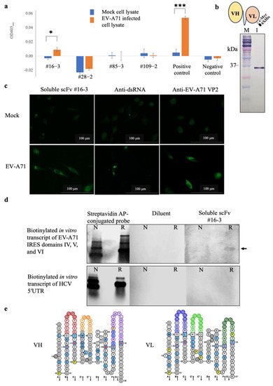 Moreover, the scFv #16-3 was predicted to be a complete antigen-binding domain as its nucleotide sequence contained a variable domain of the heavy-chain (vh) and the light-chain (vl) (Figure 5e). Taken together, it was confirmed that the scFv #16-3 was specifically bound to the EV-A71 IRES and did not bind to the non-type I IRES.