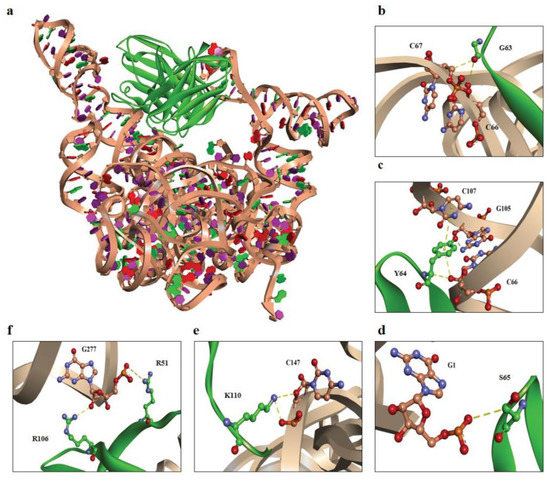 Computerized interactions between modeled EV-A71 IRES domains IV, V, and VI and scFv #16-3. (a) CDR loops and FRs of scFv #16-3 (green) interact with the EV-A71 IRES domains IV, V, and VI (beige). (b–f) representatives of the interactive residues between scFv #16-3 (green) and EV-A71 IRES domains IV, V, and VI (beige). (b) G63 and (c) Y64 are residues on VH-CDR2, (d) S65 residue is on VL-CDR2, (e) K110 is on VH-CDR3, and (f) R106 and R51 are residues on VH-CDR3 and VL-FR2, respectively. Non-covalent bonds are indicated by yellow-colored dots.