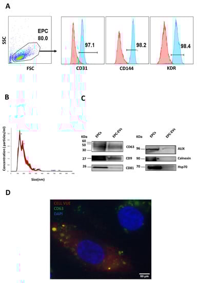 EPCs and their extracellular vesicle characterization. (A) Flow cytometry was used to assess the expression of endothelial surface markers by cells obtained from samples of human cord blood. Cells were positive for CD31, CD144, and KDR expression. The upper panels depict the expression of each single EPC marker, and the lower panels depict the double expression of EPC markers. (B) EPC-EVs were evaluated by nanoparticle tracking analysis (NTA) to determine their concentration and their size distribution. (C) Western blot analysis for cell lysate (EPCs) and extracellular vesicles (EPC-EVS) shows that the obtained vesicles express all the EV principal markers but not the endoplasmic reticulum marker (calnexin). The representative images are cropped sections of the total blot. Corresponding uncropped full-length blots are included in Supplementary File. (D) Images captured by immunofluorescence microscopy at 63X show that labeled EVs are visible in the cytoplasmic region of EPCs.