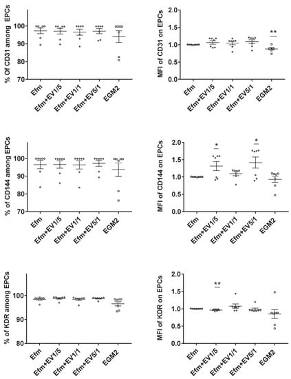Effects of EPC-EVs on the expression of EPCs’ principal markers. EPCs were cultured for 24 h in EGM2 or EV-free medium in different (EV/cell) ratios, and their expression of endothelial markers CD31, CD144, and KDR was studied by flow cytometry. Cells cultured in an EV-free medium were considered as the control group; therefore, all other data were compared to this group. Each dot presents a measured value (n = 7) collected from 3 independent experiments. All values per group are expressed as a mean (±SEM). MFI values have been normalized with cells cultured in an EV-free medium (control group). An unpaired Student’s t-test was used to generate p values (* p < 0.05, ** p < 0.01). EGM2: endothelial cell basal medium-2 (EBM2) + EGM-2 endothelial single quotes kit (Lonza) + 5% FBS (Lonza). Efm: EV-free medium (endothelial cell basal medium-2 (EBM2) + EGM-2 endothelial single quotes kit (Lonza) + 5% EVs-depleted FBS).
