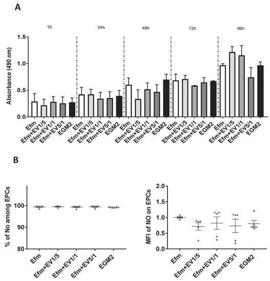 EPCs secrete an elevated amount of Nitric Oxide (NO) when subjected to stress conditions [25]. In our study, we also proved that all EPCs produced a high level of NO when stressed in deprived serum conditions (starvation in 0.2% of EVs-depleted FBS). No significant effect of EVs on NO production by EPCs was seen regardless of EV doses, meaning that EVs do not stress EPCs (Figure 3B).