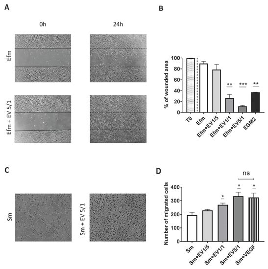 EPC-EVs promote EPC mobility and migration. EPC migration was assessed using wound healing and the transwell method. Several (EVs/EPCs) ratios were tested (1/5, 1/1, 5/1). (A) Pictures were taken with an inverted microscope (X4) showing the level of migration area. (B) Quantitative analysis of results from wound healing assay: promotion of EPCs migration is confirmed by the decrease in the scratched area when they are treated with the EVs. Cells cultured in EV-free or EGM2 medium are, respectively, considered as negative or positive control groups. (C) Pictures were taken with an inverted microscope (X10) showing migrated cells. (D) The number of migrated cells was counted using Image J software. Cells cultured in a starving medium (EBM2 (Lonza) + 0.2% EV-depleted serum) are considered the negative control group. Each dot presents a measured value (n = 3) collected from 3 independent experiments. All values per group are expressed as a mean (±SEM). Unpaired student t-test was used to generate p values (* p < 0.05, ** p < 0.01, *** p < 0.001). ns: non-significant). (0 h:0 h, 24 h:24 h, Efm: EV-free medium, Sm: starving medium.).