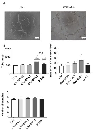 Endothelial cells can form tubes in the presence of extracellular matrix (ECM) components. To assess the effect of EPC-EVs on EPC tube formation, we seeded EPCs alone or with several doses of EVs on the Geltrex extracellular matrix. Several images were taken every 2 h to analyze the tube length, number of closed structures, and branching points. We found that EPCs treated with a 5/1 dose of EVs were able to form a complex tubular structure after 24 h (Figure 5A).