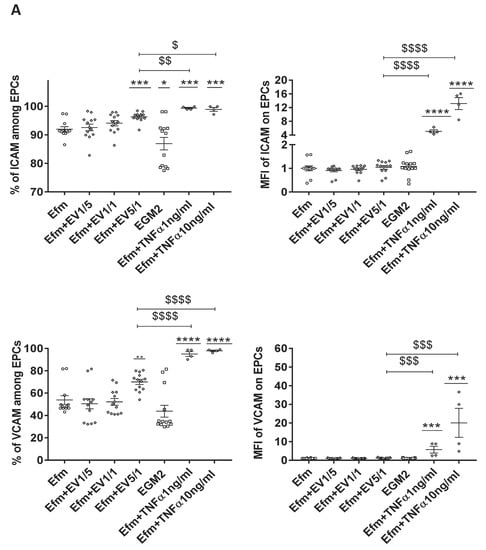The impact of EPC-EVs on EPC inflammatory markers expression. (A,B) EPCs were cultured for 24 h in an EV-free medium with different (EVs/EPCs) ratios or with 2 doses of TNFα (1 ng/mL and 10 ng/mL), then assessed for the percentage of expression and the mean fluorescent intensity of the inflammatory surface markers ICAM, VCAM, TIE2, TNFR1. Results are depicted as mean (±SEM) of 4 independent experiments. Cells cultured in an EV-free medium without TNFα are considered the control group. MFI values have been normalized with cells cultured in an EV-free medium. An unpaired Student’s t-test was used to generate p values (* p < 0.05, *** p < 0.001, **** p < 0.0001) ($ p < 0.05, $$ p < 0.01, $$$ p < 0.001, $$$$ p < 0.0001) (TNFα: Tumor Necrosis Factor-alpha, Efm: EV-free medium).