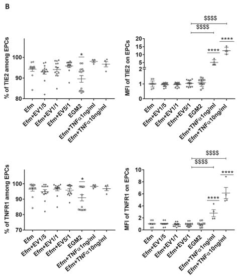 90% confluent CB-EPCs cultured in EGM2 were treated for 24 h with increasing ratios of EVs 1/5, 1/1, 5/1 (EVs/EPCs), or with TNFα (1 ng/mL and 10 ng/mL) for 24 h in EV-free medium. They were then stained with a mix of antibodies: Biotin-anti-ICAM (CD54), PE-anti-VCAM (CD106), PECY7-anti-TNFR1, FITC-anti-TNFR2, APC-anti-TIE2 (Miltenyi, Gladbach, Germany), and streptavidin-PE-cys5 (Thermofisher, Waltham, MA, USA). The labeling was evaluated by flow cytometry Fortessa (BD bioscience, Franklin Lakes, NJ, USA) and data were analyzed by FlowJo V10 software (FlowJo, LLC, Ashland, OR, USA).