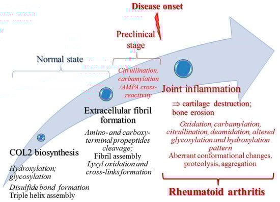 Overview of COL2 PTMs from biosynthesis and normal physiological state to rheumatoid arthritis.