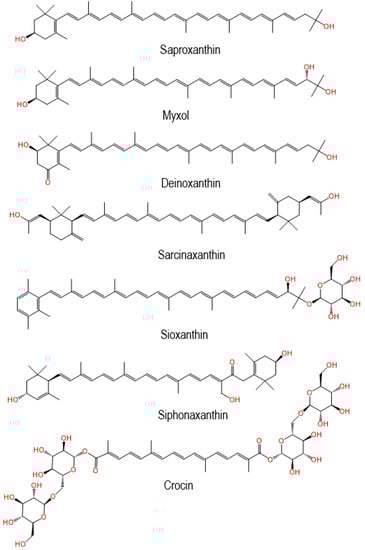 Sioxanthin is a C40 carotenoid, glycosylated on one end of the molecule. Glycosylation is an unusual feature among carotenoids and sioxanthin represents a poorly studied group of carotenoids which are polar on one end and non-polar on the other [,]. Crocin, in contrast to all other carotenoids, is a water-soluble carotenoid glycosylated on both ends of the molecule []. Crocin is effective as an antioxidant and as a learning and memory enhancer, and it shows activity against brain neurodegenerative and Alzheimer’s disorders. Crocin also shows an anti-angiogenesis effect and is likely to be involved in the regulation of molecules in the angiogenesis pathway []. However, similar to other highly bioactive carotenoids, it has limited use due to its instability at low pH and during heat and oxidative stress, and its low bioavailability, and is a unique C50 carotenoid isolated from marine bacteria, which shows high antioxidant activity in the singlet oxygen (1O2) quenching model [].