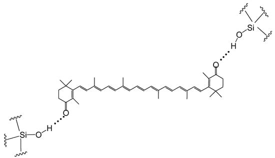 It was confirmed that canthaxanthin can form hydrogen bonds (H-bonds) on surfaces of hosts such as MCM-41 []. For example, each canthaxanthin molecule can form two H-bonds on the surface of MCM-41 (see Figure 3). Hydrogen bonds are formed with the surface silanol groups in MCM-41.