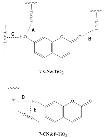 The formation of H-bonds of 7-CN on TiO2 and F-TiO2. 7-CN acts as both H-bond donor and acceptor on TiO2, but acts as only H-bond donor on F-TiO2. Adapted from Ref. [].