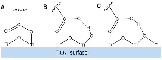 Three anchoring modes of a carboxylic acid group on the surface of TiO2: (A) the carboxylic acid group loses a proton and forms two coordination bonds with two surface Ti atoms of TiO2; (B) the carboxylic acid group loses a proton and forms one coordination bond with one surface Ti atom of TiO2 and one hydrogen bond (H-bond) with a Ti-OH group on the surface of TiO2; (C) the carboxylic acid group does not lose a proton and forms one coordination bond with one surface Ti atom of TiO2 and one H-bond due to the interaction between the OH group of the carboxylic acid group and the bridging oxygen atom on the surface of TiO2. Adapted from Ref. [].