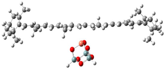 Carotene carotenoids can also form complexes with metal ions through metal–olefin interaction []. β-carotene can form a complex with Cu2+ on the surface of Cu-MCM-41, as examined by the EPR study []. Figure 8 shows the optimized complex from DFT calculations []. The EPR study showed that the formation of the complex favors the photoinduced electron transfer from β-carotene to Cu2+ and also permits thermal back electron transfer from Cu+ to β-carotene radical cation []. However, xanthophyll carotenoid canthaxanthin does not form a complex with Cu2+ on the surface of Cu-MCM-41. DFT calculations showed canthaxanthin prefers to form H-bonds with the surface silanol groups (−SiOH) because the interaction energy is higher than that between canthaxanthin and Cu2+ []. It is worth studying the rare carotenoids on the surfaces of semiconductors. For instance, deinoxanthin may form both coordination bonds and H-bonds on the surface of a semiconductor. It is important to know how the formation of those bonds affects the degree of conjugation, energies of the HOMO and LUMO, the mixing of the carotenoids’ excited states with the conduction band states of the semiconductor, and thus the photoinduced charge separation of the carotenoids. There may be steric hindrance for the interactions, depending on the types of host molecules. Choosing appropriate host molecules for semiconductors can remove or mitigate the steric hindrance.