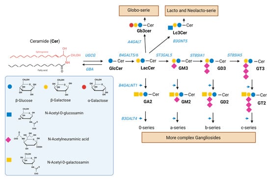 Synthesis of GSL. Ceramide (Cer) is a sphingolipid consisting of sphingosine joined by an amide linkage to a fatty acid of varying chain length and a varying degree of saturation. Glucosylceramide synthase, an enzyme encoded by the UGCG gene, catalyzes the synthesis of glucosylceramide (GlcCer) from ceramide. GlcCer is galactosylated to lactosylceramide (LacCer) by either of two lactosylceramide synthases, encoded by B4GALT5/6. LacCer is sialylated to the simple ganglioside GM3 by the sialyltransferase encoded by ST3GAL5. GM3 can be sequentially further sialylated by the sialyltransferases encoded by ST8SIA1 and ST8SIA3/5 to yield GD3 and GT3, respectively. GM3, GD3, and GT3 (as well as LacCer) can be further modified to complex gangliosides of the a-, b-, and c-series (as well as 0-series) by the enzymes encoded by B4GALNT1 and B3GALT4. LacCer can be also modified to produce the globo-serie and the lacto and neolacto-serie, via the enzymes encoded by A4GALT and B3GNT5, respectively. A deficiency in the GBA gene encoding acidic ß-glucocerebrosidase interferes with the lysosomal degradation of glycosphingolipids and results in the accumulation of glucosylceramide mainly in macrophages [32]. GSI such as miglustat and eliglustat inhibit the glucosylceramide synthase.