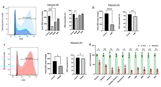 Eliglustat and miglustat inhibit the synthesis of GSL, and, therefore, a reduction in GSL expression is expected upon incubation with either inhibitor. The ganglioside GD2 is highly expressed in H3K27M-mut DMG and, therefore, can be used as a surrogate biomarker to assess the efficacy of the inhibition on GSL synthesis. To verify whether the effect of GSI on tumor cell proliferation is accompanied by a change in the expression of GD2, the H3K27M-mut DMG SF8628 cells were treated with eliglustat or miglustat, and GD2 expression was subsequently analyzed by flow cytometry. Miglustat was used at 100 µM because previous studies have shown that the treatment with miglustat at this concentration resulted in an almost complete GSL depletion [31]. Treatment with 100 µM miglustat for 72 h did not significantly impair cell viability (Supplemental Figure S1). For eliglustat, three concentrations were used: 5, 20, and 40 µM. The higher concentrations were applied only for 24 h because we have previously shown that eliglustat starts to affect H3K27M-mut DMG cell viability after 24 h of treatment [25]. No effect of 5 µM eliglustat on cell viability was observed after 72 h (Supplemental Figure S1). As shown in Figure 2a, after treatment with 40 µM eliglustat over a 24 h period, the percentage of GD2 positive cells and the GD2 mean intensity were significantly reduced. Eliglustat at lower concentrations (5 µM and 20 µM) did not significantly affect the percentage of GD2 positive cells after 24 h but significantly affected the GD2 mean intensity at 20 µM. Extending the incubation period to 72 h reduced the percentage of GD2-positive cells from 87.27% (SD ± 0.91) to 76.23% (SD ± 2.72) at 5 µM (Figure 2b) and GD2 intensity. Miglustat induced a slight but significant decrease in the percentage of GD2-positive cells and in GD2 intensity after 72 h of treatment (Figure 2c). In addition, a further downregulation of GD2 with the prolongation of the treatment was observed (10 d time point, Supplemental Figure S2). Other gangliosides and GSL series can be affected by GSI, including the globo- and lacto-series (Figure 1), which were indeed shown to be downregulated upon treatment with miglustat in colorectal cancer cells [31]. By mass spectrometry, we were able to show a significant reduction in five gangliosides (GM3, GM2, GM1, GD3, and GD2) and in neutral GSL after incubation with 100 µM miglustat for 72 h (Figure 2d).
