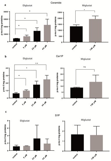 Glucosylceramide synthase inhibitors (GSIs) affect several steps of sphingolipid metabolism. SF8628 cells were treated with eliglustat at different concentrations for 24 h or with 100 µM miglustat for 72 h or mock-treated (control). Ceramide (a), Cer1P (b), and S1P (c) were analyzed by mass spectrometry and quantified as pmol per mg of proteins. Data are shown as means ± SD from three independent experiments. The statistical comparisons against the mock-treated samples for each dose were performed using student’s t-test: * p < 0.05, ** p < 0.01, ns: not significant.