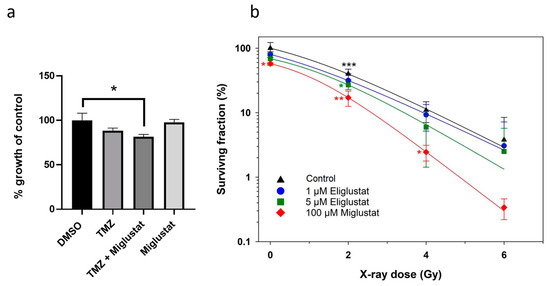 RT and TMZ are both used in the standard therapy of DMGs. We examined whether the efficacy of TMZ or RT could be improved by combining it with miglustat. As our previous results showed that GSL compositions change over time after treatment with miglustat, cells were incubated with miglustat for 72 h and then treated with TMZ after this period. DMG cells are resistant to high concentrations of TMZ (Figure 4a). A reduction in proliferation was observed after incubation with TMZ and miglustat, albeit a small one (Figure 4a). Ceramide metabolism is closely related to the cellular radiation response, and increased ceramide production can promote the radiosensitization of tumor cells. To investigate whether DMG-derived tumor cells can be radiosensitized by GSIs, the clonogenic survival of SF8628 cells was determined after concomitant treatment with X-rays and eliglustat or miglustat (Figure 4b). Treatment with 1 µM and 5 µM eliglustat or with 100 µM miglustat alone reduced the plating efficiency (PE) of SF8628 cells to 86.16% (SD ± 8.08%) and 68.78% (SD ± 15.06%) or significantly to 57.64% (SD ± 1.90%), respectively. Exposure to X-rays caused a dose-dependent reduction in the clonogenic survival of SF8628 cells. Concomitant administration of X-rays and miglustat resulted in a synergistic effect and the significant radiosensitization of SF8628 cells in an intermediate dose range of 2–4 Gray (Gy). The sensitizer enhancement ratios (SER) of 1 µM and 5 µM eliglustat or 100 µM miglustat were 1.24 and 1.48 or 2.21, respectively. In summary, while miglustat only slightly improved the efficacy of TMZ, significant radiosensitization was observed for H3K27M-mut DMG cells.