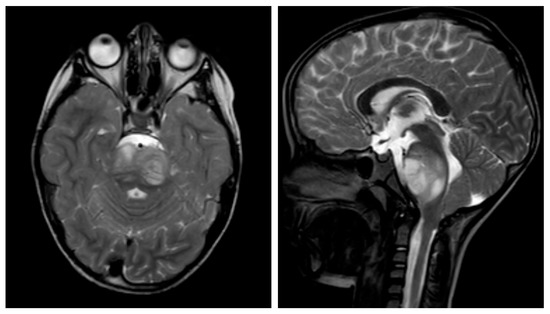 Sagittal and transverse T2-weighted turbo spin-echo (TSE) cranial magnetic resonance imaging (MRI) demonstrating diffuse midline glioma of a seven-year-old boy. The lesion appears as a mixed hyperintense and isointense area in the dorsal aspect of the brainstem, with associated edema and compression of the fourth ventricle.